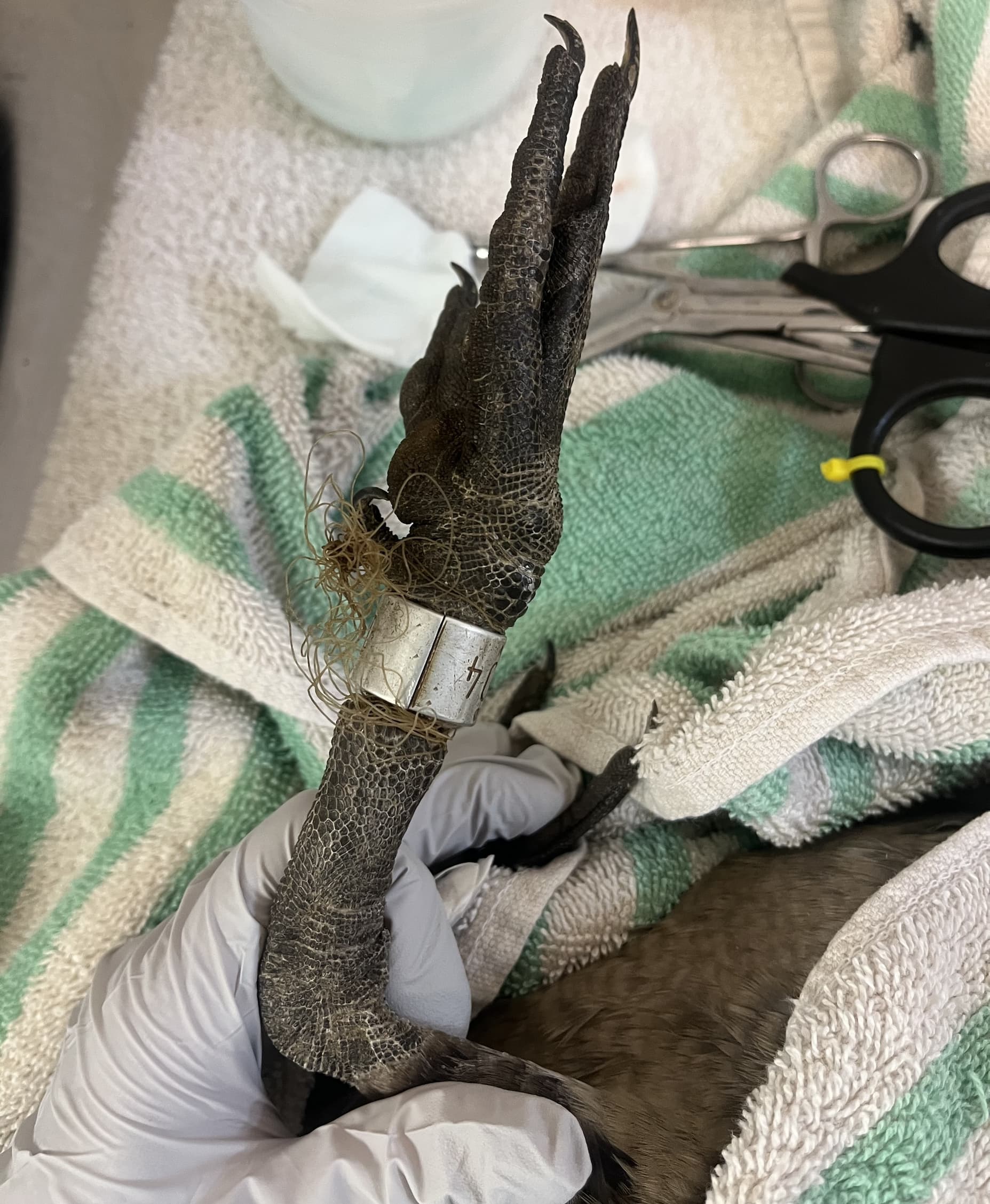 They say things come in threes and this month we’ve had three patients admitted for entanglement in fishing line. This nēnē / Hawaiian Goose was admitted earlier this month with monofilament line wrapped around its lower leg, leaving behind a deep wound once removed at intake. A couple weeks of bandage changes and wound care, and this bird is doing well. We are hopeful this nēnē will continue to heal and be ready to move into an outdoor enclosure soon!